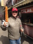 This is our favorite potato “Christmas Tree” vendor. The tree is one, delicately, spirally sliced potato, dipped in special flour/egg batter, deep fried to golden perfection and sprinkled with special herbs and spices. And, of course, the requisite four striped slather of ketchup — all on one, long bamboo skewer! The thinness of the slice makes it a hybrid somewhere between one very long french fry and one very long potato chip. We are not sure how to eat it. If you eat it like boiled, corn on the cob, you will get ketchup on your face somewhere. If you pick at it, tearing off pieces, remember it is one slice. Some pieces may crumble and fall. Be aware, too, of ketchup drip. One thing is for sure, always stand upwind to avoid ketchup splatter and be sure to get some napkins. They aren’t offered with the product, so you may have to ask for them or bring along your own supply.